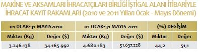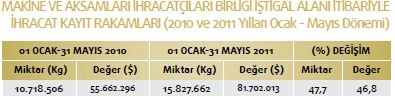 Makine ve Aksamları İhracatçıları Birliği iştigal alanına giren GTİP’ler kapsamında belirlenen Türkiye geneli ihracat kayıtlarına göre ise; 2010 yılı Ocak-Mayıs döneminde ihracat kayıt rakamı 2 milyar 482 milyon 181 bin dolar iken, bu rakam 2011 yılı aynı döneminde yüzde 31,6 oranında artarak 3 milyar 265 milyon 809 bin dolara yükseldi. Makine sektörü toplamı 84’üncü faslın tamamı ve 84’üncü fasıl dışı birliğimiz iştigal alanı toplamından oluşan makine sektörünün tamamının ihracatı 2010 yılı Ocak-Mayıs döneminde 3 milyar 960 milyon 390 bin dolar iken, bu rakam 2011 yılı aynı döneminde yüzde 23 oranında artarak 4 milyar 870 milyon 260 bin dolar oldu. Mal grupları bazında incelendiğinde ise 2011 yılı Ocak-Mayıs döneminde ihracatında en fazla artışın motorlar, aksam ve parçalarında yaşandığı ortaya çıktı. Yüksek artış gösteren kalemlerin ilki yüzde 193,8 ile motorlar, aksam ve parçaları; ikincisi yüzde 67,2 ile reaktörler ve kazanlar, üçüncüsü yüzde 62 ile endüstriyel klimalar ve soğutma makineleri oldu. Daha sonra sırasıyla yüzde 56,6 ile inşaat ve madencilik makineleriyle son olarak yüzde 51 ile rulmanlar olarak gerçekleşti. OAİB iştigal alanına giren ürünler itibariyle, mal gruplarının sektör ihracatından aldıkları paylar incelendiğinde; 2011 yılı Ocak-Mayıs döneminde yüzde 17,0 pay ile endüstriyel klimalar ve soğutma makineleri birinci, yüzde 13,5 pay ile inşaat ve madencilikte kullanılan makineler ikinci, yüzde 8,8 pay ile pompa ve kompresörler üçüncü sırada yer aldı.