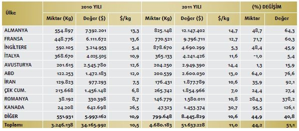 Ülkeler itibariyle ihracat kayıt rakamları incelendiğinde; 2011 yılı Ocak-Mayıs döneminde en fazla ihracat yapılan ilk üç ülke sırasıyla Almanya, İran ve İngiltere’dir. Söz konusu dönemde ilk on ülke arasında en büyük ihracat artışı yüzde 102,6 ile Rusya’ya yönelik oldu. Anılan ülkeye ihracatımız 160,1 milyon dolar olarak gerçekleşti. 2011 yılı Ocak- Mayıs döneminde mal grupları bazında en fazla ihracat yapılan ülkeler şunlardır: Endüstriyel klimalar ve soğutucularda Almanya, İngiltere, Fransa; inşaat ve madencilik makinelerinde Almanya, Tunus, İran; takım tezgâhlarında İran, Almanya, Rusya; pompa ve kompresörlerde Almanya, ABD, İngiltere; gıda sanayii makinelerinde Almanya, İran, Irak; savunma sanayi için silah ve mühimmatta S. Arabistan, Azerbaycan, ABD; tekstil ve konfeksiyon makinelerinde Etiyopya, Hindistan, İran; hadde ve döküm makinelerinde İran, Almanya, Rusya; tarım ve ormancılık makinelerinde ABD, Sudan, Irak; vanalarda Almanya, Irak, İran; reaktör ve kazanlarda Almanya, İngiltere, İtalya; türbin, turbojet ve hidrolik silindirlerde ABD, Fransa, Çin; endüstriyel ısıtıcı ve fırınlarda Rusya, Almanya, İran; yük kaldırma, taşıma ve istif. makinelerinde Rusya, İran, Irak; ambalaj makinelerinde İtalya, Irak, Cezayir; kauçuk, plastik, lastik işleme makinelerinde Rusya, İran, Bulgaristan; rulmanlarda Almanya, Fransa, İngiltere; kağıt ve matbaacılık makinelerinde Almanya, Rusya, İran’dır.