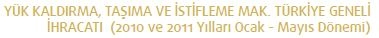 Makine ve aksamları ihracatımızın en önemli kalemlerinden biri olan yük kaldırma, taşıma ve istifleme makineleri ihracatımız 2011 yılının Mayıs döneminde artış kaydetti. Geçtiğimiz yılın Mayıs dönemi ile karşılaştırıldığında değer bazında yüzde 46,8 yükseldi. Değer olarak ise 2010 yılının Mayıs döneminde 55 milyon 662 bin dolar olan yük kaldırma, taşıma ve istifleme makineleri ihracatımız, 2011 yılının Mayıs döneminde ise yüzde 46,8 oranında artarak 81 milyon 708 bin dolar oldu. Yük kaldırma, taşıma ve istifleme makineleri ihracatımızın en fazla olduğu yer ise Rusya Fed. oldu. Söz konusu yere 2011 yılının Mayıs döneminde 8 milyon 972 bin dolarlık yük kaldırma, taşıma ve istifleme makineleri ihracatı gerçekleştirildi. Bu mal grubu içerisindeki en büyük ikinci ihracat pazarımızın ise İran olduğu görülüyor. İran’a 2010 yılının Mayıs döneminde 3 milyon 802 bin dolarlık yük kaldırma, taşıma ve istifleme makineleri ihracatımız söz konusu iken 2011 yılının aynı dönemine gelindiğinde 7 milyon 325 bin dolar ihracat düzeyi yakalandı. Yük kaldırma, taşıma ve istifleme makineleri ihracatımızın üçüncü en büyük pazarı ise Irak oldu. Irak’a 2010 yılının Mayıs döneminde 3 milyon 776 bin dolarlık yük kaldırma, taşıma ve istifleme makineleri ihracatımız söz konusu iken 2011 yılının aynı dönemine gelindiğinde 5 milyon 711 bin dolara yükseldiği görüldü. Yük kaldırma, taşıma ve istifleme makineleri ihracatımızda dördüncü sırada Azerbaycan yer alıyor. Azerbaycan’a 2010 yılında 4 milyon 453 bin dolarlık ihracat gerçekleşirken 2011 yılında 5 milyon 711 bin dolar ihracat gerçekleşti. Yük kaldırma, taşıma ve istifleme makineleri ihracatımızın 2011 yılı Mayıs döneminde en fazla artış gösterdiği ilk beşte yer alan beşinci ülkenin ise Cezayir olduğu açıklandı. Cezayir’e 2010 yılında 1 milyon 669 bin dolar ihracat yaparken 2011 yılında 3 milyon 605 bin dolar ihracat gerçekleşti. Yük kaldırma, taşıma ve istifleme makineleri ihracatımızda değer bakımdan ise ilk üç sırada yüzde 497,2 değer artışı ile Rusya Fed. yer alıyor. Söz konusu ülkeden sonra yüzde 294,7 ile Romanya ve sonrasında yüzde 249,8 oranında yükselişle Fransa takip ediyor.