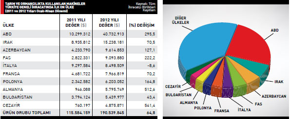Aynı dönemin 2012 yılında yapılan ihracat kıyaslandığında 9 milyon 614 bin dolar değerinde tarım ve ormancılıkta kullanı- lan makine ihraç edildi. Listenin dördüncü sırasında bulunan Fas’a yönelik yapılan ihracatın 2011 yılında 2 milyon 822 bin dolar değerinde olduğu görülüyor. 2012 yılının Ocak-Nisan döneminde ise tarım ve ormancılıkta kullanılan makineler ihracatında ise 9 milyon 93 bin dolar seviyesine ulaşıldı. Listenin beşinci sırasında ise İtalya var.
