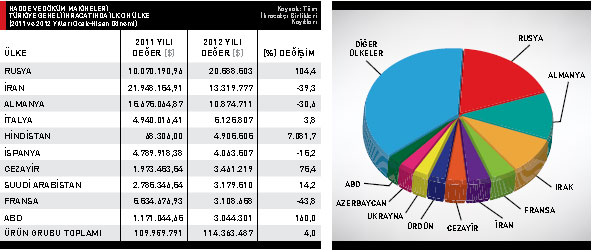 İran’a 2012 yılının Ocak-Nisan ayları kapsamında 13 milyon 319 bin dolar değerinde ürün gönderildi. Üçüncü sırada bulunan Almanya’ya ise 2012 yılının aynı döneminde 10 milyon 874 bin dolar değerinde hadde ve döküm makinesi gönderildi.