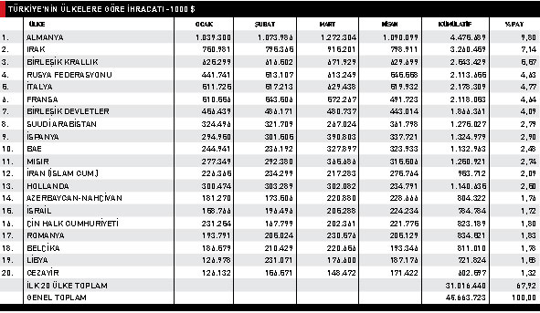 Listenin ikinci sırasında ise yüzde 6,7 oranında artışla Almanya’ya yapılan ihracatta 2012 yılının Ocak-Nisan döneminde 18 milyon 621 bin dolar seviyesine ulaşıldı. İran ise sıralamada üçüncü sırada yer aldı.