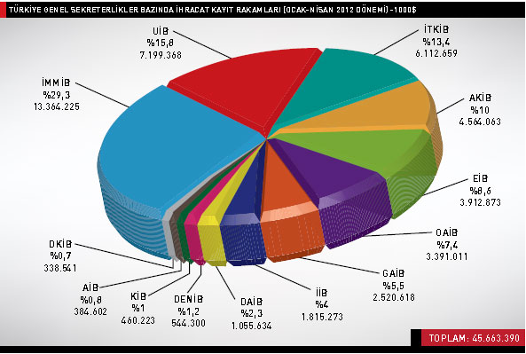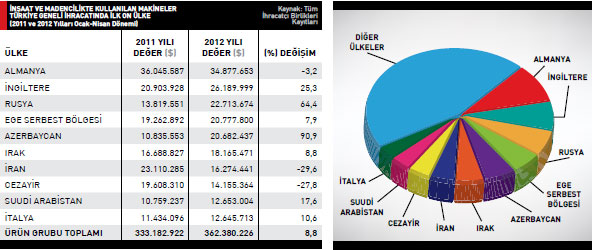 2012 yılında ise ihracat değeri 595 milyon dolar seviyesine yükseldi. İnşaat ve madencilikte kullanılan makineler ise en fazla ihracatı gerçekleşen üçüncü kalem oldu. 2011 yılının Ocak-Nisan döneminde 333 milyon dolar olan söz konusu sektör 2012 yılının aynı döneminde yüzde 8,8 oranında artış göstererek 362 milyon dolar oldu. Tüm İhracatçı Birlikleri kayıtlarına göre; 2011 yılının Ocak-Nisan döneminde 3 milyar 786 milyon dolar olan toplam ihracat yüzde 18,9 oranında arttı. 2012 yılının aynı döneminde ihracat rakamı 4 milyar 502 milyon dolar seviyesine yükseldi.