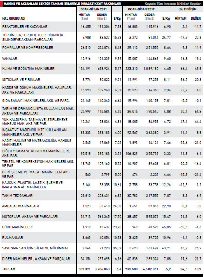 Makine ve aksamları ihracatı 2012 yılı Ocak-Nisan döneminde yüzde 18,9 oranında artarak 4 milyar 502 milyon dolar seviyesineulaştı. Türkiye’nin makine ihracatında ilk on ülke arasında ise Almanya 725 milyon 800 bin dolar ile birinci sırada yer aldı.