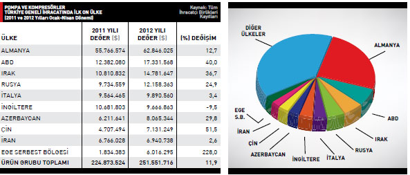 Ocak-Nisan döneminde 224 milyon dolar değerinde ihracat gerçekleşti. 2012 yılının aynı döneminde ise bu rakam 251 milyon dolara yükseldi. Pompa ve kompresörler ihracatımızda en fazla ürün gönderdiğimiz ülke Almanya oldu.