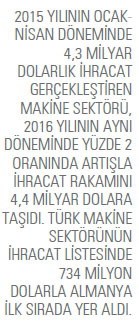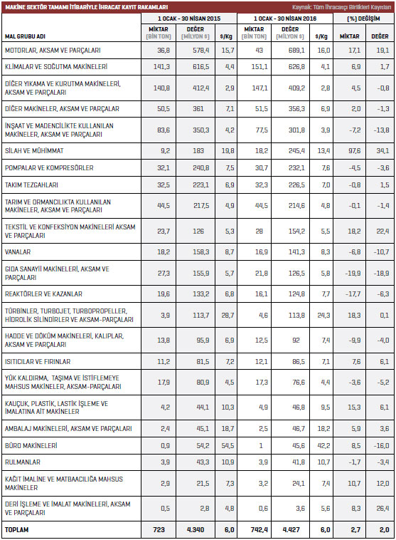 u. 2016 yılının Ocak-Nisan dönemi itibariyle makine sektöründe en fazla ihracat gerçekleştiren üçüncü kalem ise 409,2 milyon dolarlık ihracat değeriyle diğer yıkama ve kurutma makineleri, aksam ve parçaları oldu.