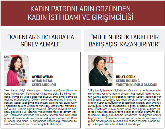 Toplantıyı takip eden Türkiye’nin başarılı kadın girişimcileri ise kısa sunumlarında, kadın girişimciliğinin ve kadın çalışan sayısını artırmanın önemini vurguladı. Gedik Holding Yönetim Kurulu Başkanı Hülya Gedik, “En çok pişmanlık duyduğum konu mühendis olmamaktır. Mühendis kızlara bayılıyorum. Çok analitik düşünüyorlar. Mühendislik, sadece mesleki olarak değil, normal hayatta da çok farklı bakışla olaylara bakılmasını sağlıyor. Ben, iş aşkıyla dolu ve hırslı bir babanın kızıyım: Cumartesi günü doğum yaptım, babam bana ‘Aferin Hülya, cumartesi doğum yaptın, pazartesi iş başı!’ dedi. Herkese şaka gibi geldi ama pazartesi iş başı yaptım. Bunu da severek yaptım” derken, Gözüküçük Makina Yönetim Kurulu Başkanı Zuhal Gözüküçük ziraat mühendisi iken nasıl makine sanayicisi olduğunun hikâyesini dinleyicilerle paylaştı. Ayhan Metal Genel Müdürü Aynur Ayhan ise “Kadınların üretimde yer alması önemli ama daha da önemli olan kadınların STK’larda görev almasıdır. Ancak böylece sektördeki sorunlara çözüm geliştirebilirsiniz” değerlendirmesinde bulundu.