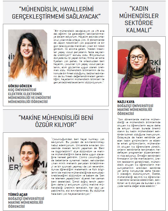 Boğaziçi Üniversitesi Makine Mühendisliği öğrencisi Nazlı Kaya da kadınların mühendislik alanında rekabet için her türlü niteliği taşıdığına dikkat çekerken, “Önemli olan kadınların iş hayatına katılımını sağlarken, bu vasıflara sahip isimleri sektörde tutabilmek. Kadınların sektöre katılımı konusunda destek veren bu projelerden mutluluk duyuyoruz” dedi.