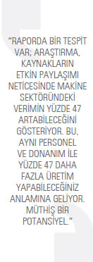 Raporda bir tespit var; araştırma, kaynakların etkin paylaşımı neticesinde makine sektöründeki verimin yüzde 47 artabileceğini gösteriyor. Bu, aynı personel ve donanım ile yüzde 47 daha fazla üretim yapabileceğiniz anlamına geliyor. Müthiş bir potansiyel. İmalat sanayiinin ortalamasından daha verimli olmak yetmiyor; bugün 500 milyar TL’lik makine imalat yatırımı var ise 250 milyar TL’lik yeni yatırıma tekabül eden bir üretimden bahsediliyor. Ya da 55 milyar TL’lik yıllık toplam üretimin, sadece verimlilik artışı ile 80 milyar TL’ye ulaşabileceğini okuyoruz. Bunun ihracata ve Ar-Ge’ye sağlayacağı katkı raporda ayrıntılı olarak var. Diğer sektörlere vereceği katkı var.