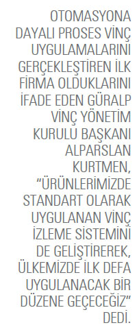 Yine her bir kaldırma makinesi FEM standardına bağlı olarak çalışan yenilikçi vinç izleme sistemi yazılımı ile gerçek zamanlı olarak sürekli denetleniyor ve kaldırılan ağırlığa göre emniyetli çalışma periyodu (SWP) hesaplanıyor. Ayrıca motor sıcaklık korumadan aşırı yük aşımına ve yük histogramı oluşturulmasına kadar birçok parametre sistem hafızasında kaydediliyor. Bu bilgiler hem ilgili Güralp Vinç servis elemanlarına, hem de yeni yatırımların olması durumunda mevcut saha için vinç çalışma sınıflarının belirlenmesine öncülük edecek çok değerli istatistiksel bilgiler içeriyor. Vinç izleme sistemimiz ayrıca operatörden kaynaklanabilecek vinç kullanım hatalarını azaltacak şekilde yapılandırılmıştır. Üretim hatlarımızda seri üretim şartlarına uygun düzenlemeler ile hem üretim adetlerinin artırılmasını, hem de kalite sürekliliğin korunmasını sağladık. Güralp Vinç bugün ayda 100 adet standart kaldırma makinesi, 80 adet yürüyüş grubu ve 60 adet çift kiriş köprü konstrüksiyonu üretebilmektedir. Oluşturulan üretim hatları alt yapısı, bu sayıları artırmaya da uygundur. Bunların yanı sıra özel üretimlerimiz de bulunuyor. Özellikle 2011 yılı son çeyreğinden bu yana, yurt içinde ve yurt dışında birçok özel projeyi üstlenip çalışır durumda teslim ettik. Halihazırda üretimi devam eden ciddi proses uygulamalarımız da var.