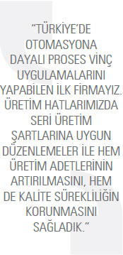 Üretimimizi, 12 bin 500 metrekaresi kapalı olmak üzere 30 bin metrekare alanda kurulu İzmir Torbalı’daki fabrikamızda gerçekleştiriyoruz. Makine parkurumuzun tamamen standart değildir. Bunun sebebi yaptığımız işin proje bazlı olması ve seri üretim şartlarını ciddi oranda ortadan kaldırmasıdır. Bu bağlamda yapılan özel makine yatırımları, üretimin nispeten seri üretim şartlarına getirilmesine yardımcı oluyor. Bu sayede de ürünün pazarda her zaman aynı kalitede ve rekabetçi olması hedefleniyor. Teknolojik seri üretim şartlarının sağlanmadığı ürünlerde kalite, verimlilik, ekonomiklik gibi değerlerden bahsetmek mümkün değildir.