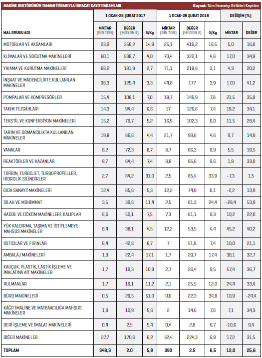 Makine sektöründe 2018 yılının Ocak-Şubat döneminde en fazla ihracat gerçekleştiren alt sektör motorlar oldu. 2017 yılının OcakŞubat döneminde söz konusu ürün grubunda gerçekleştirilen ihracat 356,2 milyon dolarken 2018 yılının aynı döneminde bu rakam yüzde 16,8 artışla 416,2 milyon dolar seviyesinde kaydedildi. Listenin ikinci sırasında bulunan klimalar ve soğutma makineleri kaleminde 2017 yılının Ocak-Şubat döneminde 238,7 milyon dolarlık ihracat gerçekleştirilirken 2018 yılının aynı döneminde bu rakam yüzde 34,9 artışla 322,1 milyon dolara yükseldi. 2018 yılının Ocak-Şubat dönemi itibarıyla makine sektöründe en fazla ihracat gerçekleştiren üçüncü sıradaki mal grubu ise 218,6 milyon dolarla yıkama ve kurutma makineleri oldu. Söz konusu ürün grubunda 2017 yılının aynı döneminde 181,9 milyon dolarlık ihracat gerçekleştirilmişti. Yıkama ve kurutma ürün grubunda yaşanan ihracat artışı yüzde 20,2 oldu.
