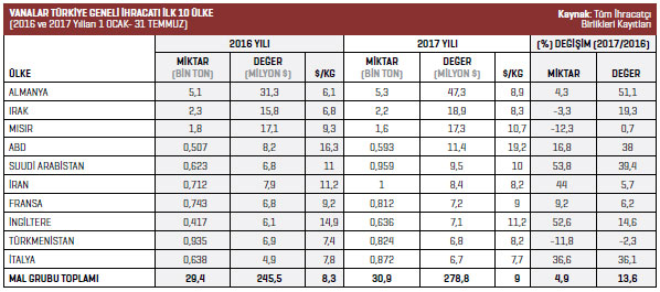 Vanalar grubunun ihracatında en fazla artış yüzde 51,1’lik artışla Almanya’da oldu. Almanya’nın ardından en fazla artışın görüldüğü ülke yüzde 39,4 ile Suudi Arabistan olurken bu ülkenin ardından en fazla artış ise yüzde 38 ile ABD’de oldu.