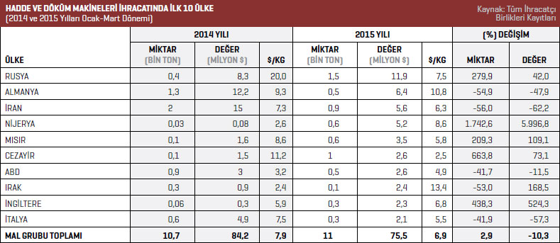 Hadde ve döküm makineleri mal grubunda 2015 yılının Ocak-Mart döneminde 11,9 milyon dolarla en fazla Rusya’ya ihracat gerçekleştirildi. Söz konusu ülkeye 2014 yılının aynı döneminde 8,3 milyon dolar değerinde ürün gönderilmişti. Rusya’ya yönelik ihracat artışı yüzde 42 oldu. Listenin ikinci sırasında yer alan Almanya’ya 2015 yılının Ocak- Mart döneminde 6,4 milyon dolarlık ihracat gerçekleştirildi. Üçüncü sıradaki İran’a 2015 yılının Ocak-Mart döneminde 5,6 milyon dolar değerinde ürün ihraç edildi. Dördüncü sırada bulunan Nijerya’ya 2014 yılının Ocak-Mart döneminde 86 bin dolar değerinde ürün ihraç edilirken 2015 yılının aynı döneminde bu rakam yüzde 5.996,8 artışla 5,2 milyon dolar seviyesine yükseldi. Listenin beşinci sırasındaki Mısır’a 2015 yılının Ocak-Mart döneminde 3,5 milyon dolar değerinde hadde ve döküm makineleri ihraç edildi. 2014 yılının aynı döneminde bu rakam 1,6 milyon dolar seviyesindeydi. Mısır’a yönelik ihracat artışı yüzde 109,1 oldu.