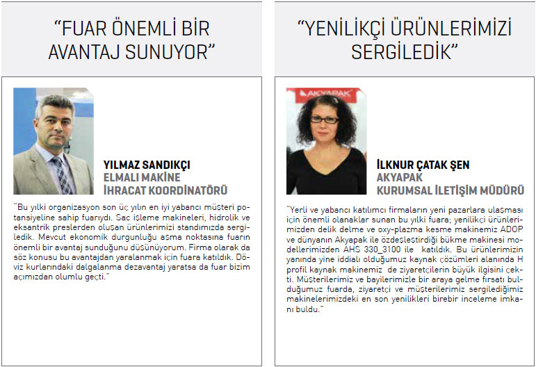 MAİB ve Türkiye’nin Makinecileri Yönetim Kurulu Üyesi Sevda Kayhan Yılmaz da konuşmasında, Almanya’nın eski bir endüstri toplumu olarak; ‘Tavşanın yattığı kadar koşacağını’ iyi bildiğini belirterek, “Şu anda Türkiye’de bir yavaşlama mı var deyip beklemek yerine, ‘Bunlar şimdi yatıyorsa koşmaya başladıklarında çok hızlı koşar!’ deyip buraya ilgisini sürdürmeye devam ettiği için teşekkür ediyorum. Her kriz Türkiye’ye bir şeyler öğretti. O nedenle bu krizden çok az etkileneceğimizi tahmin ediyor ve bekliyoruz” dedi. Yılmaz, sözlerini şöyle sürdürdü: “Durgunluk demeye dilim varmıyor çünkü öyle hissetmiyorum. Bunu iyimserlik olarak da değerlendirmeyin. Biz hayatımızda ilk defa terörle böylesine yüzleştik. Böylesine kitlesel ve beklenmedik olaylar olduğunu gördük. İlk anda bir şok geçirdik. Bu şokun sarsıntısıyla ne olduğunu anlamaya çalıştık. Her kriz Türkiye’ye bir şeyler öğretti. Biz aşılandık. Küçük küçük krizlerle mikrobu zayıflatılmışşekilde alıp, gerçek mikrop geldiğinde vücut savaşmayı öğrendi. Biz bugüne kadar çok kriz, çok sıkıntı gördük. Hepsinden de bir şeyler kazanarak çıkmayı öğrendik. Kimisinde ihracatı, kimisinde verimliliği, kimisinde yeni pazarlar bulmayı ve maliyet düşürmeyi öğrendik. Bu krizde de finansı öğrendik. Yapılan son araştırmada makine sektörünün öz kaynakla ilerlediğini ve en az borçlu sektör olduğunu gördük. O nedenle de sektörümüzden bu krizden çok az etkileneceğini tahmin ediyoruz. Bunun yanında çevre ülkelerde yaşanan rejim değişikliklerinin ekonomideki fay hatlarını kırmasıyla ürün çeşitliliğimiz dolayısıyla yeni pazarlara yönelebileceğimizi gördük. Bu durum aslında Türk makinesinin gücünü yansıtıyor. Biz günlük yükselmiş bir yıldız değiliz, biz sürekli olarak kendini geliştirmeye inanan ve bu yolda hareket eden bir sektörüz.”