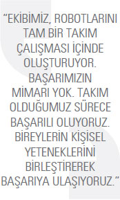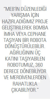 MEB’in düzenlediği robot yarışması için hazırladığımız proje geliştirilerek bomba imha veya cephane taşıyan bir robota dönüştürülebilir. Robotumuz 28 kilogram olmasına rağmen denemelerimizde 100 kilogramın üzerinde yük taşımayı başardı. Aynı zamanda bulunduğu konumda 360 derece dönebiliyor ve merdivenlerden rahatlıkla çıkabiliyor. Üniversite yarışmaları için hazırladığımız projelerle ilgili ise kullanım alanı tanımlayamayız. Bu çalışmaları öğrencilerimizin birbirine adapte olmuş sistemleri yakından tanıyarak ufuklarını genişletmeleri için hazırladık.