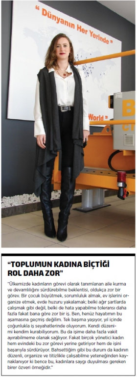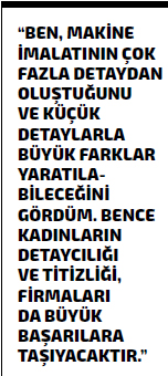 Yurt dışı satışlarıyla yoğun olarak ilgileniyorum ve yabancı firmaları ziyarete gittiğimde de bir kadını karşılarında görmek onları şaşkınlığa uğratıyor. Kadınlara yönelik bu bakış açısı sadece ülkemizde değil Avrupa’da, Rusya’da ve dünyanın birçok yerinde aynı. Hatta bu tezimi Avrupa’da bulunan firmaların çoğunda kadın yöneticilere, erkek yöneticilere kıyasla yüzde 20-25 oranında daha düşük maaş verildiği bilgisiyle de destekleyebilirim. Muhataplarıma Türkiye’de birçok başarılı şirketin üst yönetim kademelerinde kadınların yer aldığından söz ettiğimde, kendilerinin de bu başarılı kişilerden haberdar olduklarını fark ettim. Bana, bu başarıyı neye bağladığımı sorduklarındaysa “İşini ciddiye alan bir kadının işini takip edebilme kabiliyeti, küçük şeylerin aslında büyük bir parçayı oluşturduğunun farkındalığı yani detaycı oluşu, gerektiğinde de o küçük parçanın bile peşini bırakmayacak kadar önem vermesi yönetici kadınların başarılı olmalarını sağlayan faktörlerindendir” diyerek cevap verdim. Kadınlar bir işi üstlendiğinde, onu, en iyisi olması dileğiyle titizlik ve özenle gerçekleştirir. İşlerini daha planlı ve organize biçimde yapmayı sever. Ben, makine imalatının çok fazla detaydan oluştuğunu ve küçük detaylarla büyük farklar yaratılabileceğini gördüm. Bence kadınların bu özellikleri, firmaları da büyük başarılara taşıyacaktır.