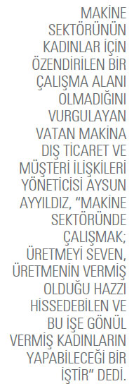 Makine imalat sektörünün diğer sektörlere kıyasla kadınlar için çok konforlu olmadığını söyleyen Vatan Makina Dış Ticaret ve Müşteri İlişkileri Yöneticisi Aysun Ayyıldız, “Makine sektöründe görev yapıyor olmanız için teknik açıdan da vasıflı olmanız gerekiyor. Fakat ülkemizde kız çocuklarının eğitim hayatları boyunca bu alana yönlendirilmiyor. Genel itibariyle ebeveynler, kızları öğretmenlik, doktorluk gibi meslekleri yapsın istiyor. Makine sektörü, eğer kişinin özel bir ilgisi yoksa kadınlar için özendirilen bir çalışma alanı değil” dedi.