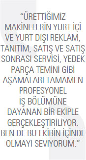 bazen makine başında izleyerek, bazen de mantık yürüterek. Bilginin doğruluğundan emin olana kadar sorguluyorum. Daha işin çok başındayım. O yüzden benim için her proje ve her makine ayrı bir merak unsuru. Yeni bir şeyler öğrenmek de işinizi daha cazip kılan sebeplerden. Ürettiğimiz makinelerin yurt içi ve yurt dışı reklam, tanıtım, satış ve satış sonrası servisi, yedek parça temini gibi işleri tamamen profesyonel iş bölümüne dayanan bir ekip işidir. Bu ekibin içinde olmayı seviyorum. Ekip liderimiz de yol gösterici, tecrübeli, ileri görüşlü, soğukkanlı-sakin, yeniliklere açık ve iletişim kurması kolay birisi olduğu için başarı da beraberinde geliyor.