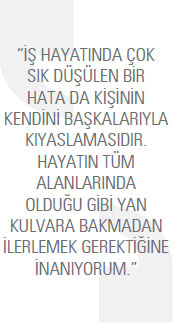 Her şeyden önce kadın,erkek ayırmadan çalışanın her zaman kazanacağını düşünüyorum. İş hayatında çok sık düşülen bir hata da kişinin kendini başkalarıyla kıyaslamasıdır. Hayatın tüm alanlarında olması gerektiği gibi iş yaşamında da yan kulvara bakmadan ilerlemek gerektiğine inanıyorum. Soğukkanlı olmak çok önemli. Ayrıca kadınlar sorumluluk almaktan korkmamalı ve gerektiğinde inisiyatif kullanmaktan da çekinmemelidir.