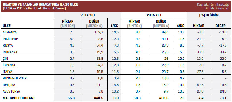 Reaktörler ve kazanlar ürün grubunda 2015 yılının Ocak-Kasım döneminde 89,4 milyon dolarla en fazla Almanya’ya ihracat gerçekleştirildi. İkinci sırada yer alan İngiltere’ye 2014 yılının Ocak-Kasım döneminde 42,6 milyon dolarlık ihracat gerçekleştirilirken 2015 yılının aynı döneminde bu rakam yüzde 15,2 artışla 49,1 milyon dolar seviyesine yükseldi. Listenin üçüncü sırasında bulunan Rusya’ya 2015 yılının Ocak-Kasım döneminde 28,3 milyon dolarlık ihracat gerçekleştirildi. Listenin dördüncü sırasında bulunan Romanya’ya 2015 yılının Ocak-Kasım döneminde 26,5 milyon dolarlık ürün ihraç edildi. 2014 yılının aynı döneminde bu rakam 19,9 milyon dolardı. Romanya’ya yönelik ihracat artışı yüzde 33,4 olarak kaydedildi. Beşinci sıradaki Çin’e 2015 yılının Ocak-Kasım döneminde ihraç edilen reaktörler ve kazanların değeri 26 milyon dolar seviyesinde kaydedildi. 2015 yılının Ocak-Kasım döneminde Türkiye geneli reaktörler ve kazanlar ürün grubunda en fazla ihracat artışı yüzde 33,4 ile Romanya’da yaşandı. Bu ülkenin ardından yüzde 24 ile Avusturya gelirken yüzde 19,6 ile Belçika üçüncü sırada yer aldı.