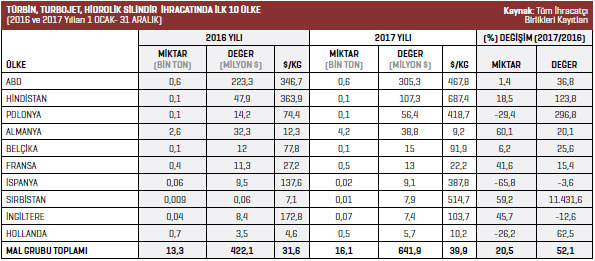 Türbin, turbojet, hidrolik silindir ihracatı 2017 yılında 641,9 milyon dolar olarak kaydedildi. 2016 yılında bu rakam 422,1 milyon dolardı. Türkiye’nin türbin, turbojet, hidrolik silindir ürün grubundaki ihracat artışı yüzde 52,1 oldu.