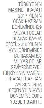 2017 yılının Ocak-Haziran döneminde Türkiye’nin makine ihracatı 6,9 milyar dolara yükseldi. Türkiye’nin en fazla ihracat gerçekleştirdiği ilk 20 ülke listesinde 2017 yılı Ocak-Haziran dönemi itibarıyla Almanya 1,1 milyar dolarla ilk sırada yer alıyor. Listenin ikinci sırasındaki ABD’ye yönelik makine ihracatı, 2017 yılı Ocak-Haziran döneminde 473,6 milyon dolar olarak kaydedildi. Türkiye’nin en fazla makine ihracatı gerçekleştirdiği ilk 20 ülke listesinin üçüncü sırasında ise İtalya bulunuyor. İtalya’ya 2016 yılının Ocak- Haziran döneminde 317,9 milyon dolarlık ihracat gerçekleştirilirken 2017 yılının aynı döneminde bu rakam yüzde 7,7 artışla 342,6 milyon dolar seviyesine yükseldi.