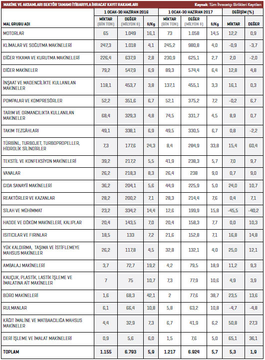 Makine sektöründe 2017 yılı Ocak- Haziran döneminde en fazla ihracat gerçekleştiren alt sektör motorlar oldu. 2016 yılının Ocak-Haziran döneminde söz konusu ürün grubunda gerçekleştirilen ihracat 1,05 milyar dolarken 2017 yılının aynı döneminde bu rakam yüzde 0,9 artışla 1,06 milyar dolar seviyesinde kaydedildi. Listenin ikinci sırasında bulunan klimalar ve soğutma makineleri kaleminde 2017 yılının Ocak-Haziran döneminde gerçekleştirilen ihracat 980,8 milyon dolar oldu. 2017 yılı Ocak-Haziran dönemi itibarıyla makine sektöründe en fazla ihracat gerçekleştiren üçüncü kalem ise 625,1 milyon dolarlık ihracat değeriyle diğer yıkama ve kurutma makineleri olarak kaydedildi.
