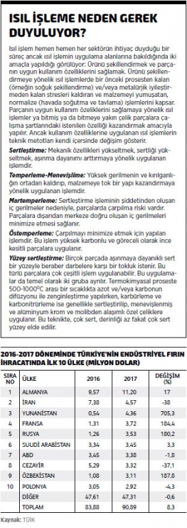 Çeliği ham madde olarak alıp, çeşitli imalat yöntemleriyle şekil verdikten sonra nihai parça/komponent haline getiren tüm imalatçılar; kullanım yeri ve amacına bağlı olarak, malzemenin istenen ömürde olabilmesi ve beklenen fonksiyonu yerine getirebilmesi için üretim süreçlerinin belirli bir aşamasında “ısıl işlem” uygulamak zorunda. Bu kapsamda otomotiv, makine imalat sektörleri, havacılık ve savunma sanayileri, kalıp imalat ve genel imalat sektörlerinde ısıl işlem, olmazsa olmaz bir üretim sürecini oluşturuyor.