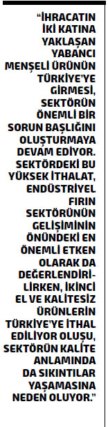 Bu çerçevede, EFSİAD Yönetim Kurulu Başkanı Mehmet Özdeşlik, Türk endüstriyel fırın imalat sektörünün oldukça gelişmiş olduğunun altını çizerken, sektörün oldukça geniş bir ihracat yelpazesi olduğunu da anımsatıyor. Ancak Özdeşlik, yüksek ithalatın sektörün en önemli sorun başlığı olmaya devam ettiğini de söylüyor: “Özellikle çok ucuza gelen veya ekonomik ömrünü tamamlamış ikinci el fırınlar, sektörün gelişmesinin önünü tıkıyor.”