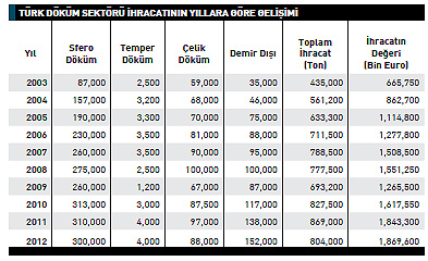 Türk döküm sanayinin 2011 yılı direkt ihracatının toplam değeri (pik, sfero, temper, çelik, bakır alaşımları ve alüminyum döküm) 1.843 milyar euro olarak gerçekleşmiştir. Türkiye döküm üretiminin miktar olarak yüzde 61’i ciro olarak ise yüzde 74’ü 2011 yı¬lında ihraç edilmiş ve toplam ihracatın yüzde 75’i Avrupa ülkelerine yapılmıştır. Bu miktara yerli imal edilmiş araç, sanayi malı ve teçhizatta bulunan döküm parçaları dahil edildiğinde sektörün ihracat tutarının 3 milyar euro’yu aştığı tahmin ediliyor.