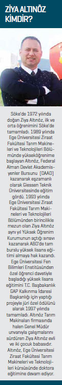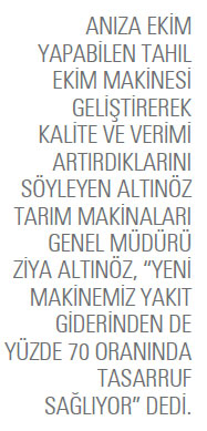 1970’li yıllarda frezeli ara çapa makinesini Türkiye’de geliştiren ilk firma olduk ve ödül aldık. Bu çerçevede tarımsal mekanizasyonun gelişmesinde öncü olduğumuzu söylemek isterim. Altınöz Tarım olarak TÜBİTAK Ar-Ge desteği ve Ege Üniversitesi Ziraat Fakültesi Tarım Makineleri Ana Bilim Dalı ortak çalışmasıyla tamamen özgün, toprak işlemesiz doğrudan anıza ekim yapabilen tahıl ekim makinesini geliştirdik. Makinemiz son derece efektif bir dizayna sahip. Ayrıca birim alandaki yakıt giderinden yüzde 70 oranında tasarruf sağlayan ve erkenci ürün yetiştirmede verim ile ürün kalitesini arttıran bir makinedir. Özellikle Asya ve Avustralya’daki büyük üreticilerin beğenisini kazanan makinemiz Gıda Tarım ve Hayvancılık Bakanlığı, Birleşmiş Milletler Gıda ve Tarım Örgütü (FAO), Kuru Tarım Alanlarında Uluslararası Tarımsal Araştırma Merkezi (ICARDA) gibi kuruluşlar tarafından da takdire değer görüldü. Ayrıca makinemiz TOBB Aydın ili genelinde sanayi dalında Ar-Ge birincisi de seçildi. Firmamız geçtiğimiz yıl gerçekleştirdiği sekiz buluşun patentini de aldı.