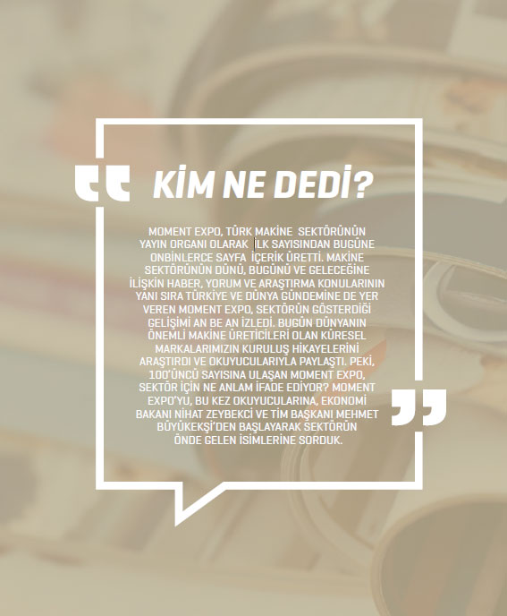 Moment Expo, bir yanıyla kurumsal hafızayı temsil ediyor. Öte yanıyla da sunduğu zengin içerikle sanayinin gelişimine önemli bir katkı sağlıyor. Derginin 100 sayılık geçmişini ele aldığımızda, buradaki içeriğin makine sektörüyle sınırlı kalmadığını, Türk sanayisinin tamamına hitap ettiğini görüyoruz. Başta yurt dışıyla iş yapan ihracatçılarımız olmak üzere, Türkiye sanayisinin gelişimiyle ilgilenen ve ekonomimizin rekabetçi bir karakter kazanabilmesi üzerine kafa yoran herkesin yararlanabileceği kıymetli bir kaynak olduğunu düşünüyorum. Moment Expo’nun bu kadar uzun bir zaman boyunca kalitesini koruyabilmesinde ve 100. sayıya ulaşabilmesinde okuyucuyla etkileşim halinde olmasının önemli bir payı var. Bu anlayış doğrultusunda kendisini sürekli yenileyerek 200. sayıya doğru yol alacağına inanıyorum.