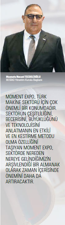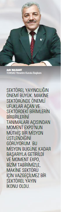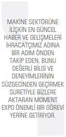 Moment Expo, bütünlüklü bir stratejinin parçasıdır. Biz, göreve geldiğimizde, bırakın makine sektörünün önemini, sektörümüzün varlığından bile birçoklarının haberi yoktu. Dolayısıyla, popüler kültürü kullanarak, “Tıkır Tıkır” kampanyası ve Moment Expo’nun yayın hayatına başlatılmasını sağlayarak sektörümüzün tanıtımını amaçlamıştık. Bunların hepsi, bir stratejinin parçalarıydı. Çok şükür ki bu tanıtımı başarıyla gerçekleştirdik: Türkiye bugün, siyasetçisi, bürokratı ve kamuoyu ile bir ülkenin üretim araçlarını üretmesinin ne kadar önemli olduğunu biliyor. Ama bu bilincin oluşması demek, gereken güce ulaştığımız anlamına gelmiyor. Üretim kültürümüz arttıkça, nitelikli ve kalifiye insan kaynaklarımız arttıkça, vizyoner girişimcilerimiz çoğaldıkça daha da güçleneceğiz.