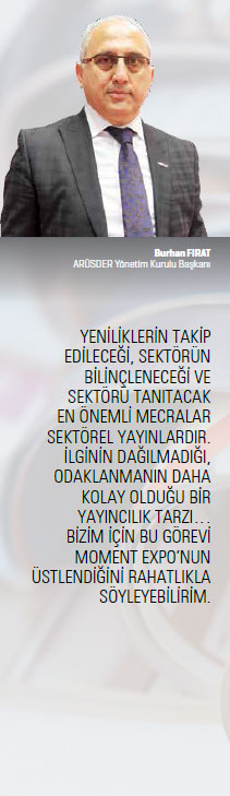 Sektör için bir arşiv niteliği taşıyan Moment Expo’nun başka bir işlevi de yerli üreticinin birbirini tanıyarak işbirliğini artıracak ortam oluşmasını sağlaması. Ancak böyle, ölçek ekonomisini yakalayarak, rekabetçi hale dönüşebiliriz. İlginçtir, son yıllarda yurt dışı fuarlarda, diğer ülkeler kadar Türk firmaları da müşteri olarak ziyaret etmeye başladı. Dergimiz de, birbirimizi tanımamız için iyi bir araç.