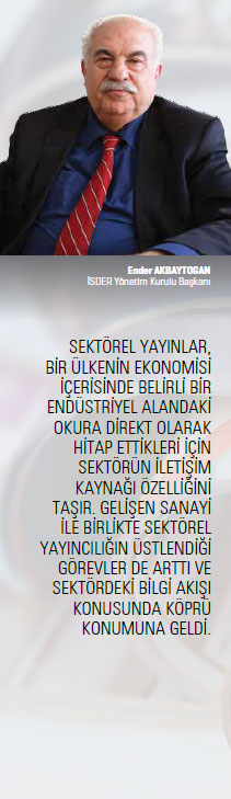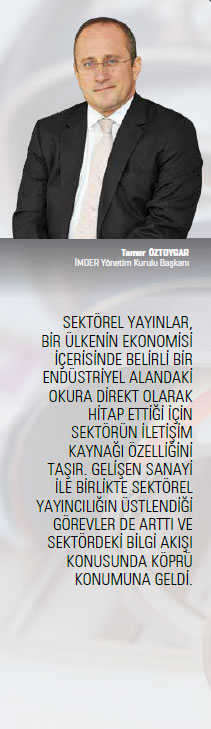 Diğer yandan, sektörel yayınlarımız, bir ülkenin ekonomisi içerisinde belirli bir endüstriyel alandaki okura direkt olarak hitap ettiği için sektörün iletişim kaynağı özelliğini taşır. Gelişen sanayi ile birlikte sektörel yayıncılığın üstlendiği görevler de arttı ve sektördeki bilgi akışı konusunda köprü konumuna geldi. Sektörümüzdeki her türlü gelişmeyi takip etmeleri, bu alandaki kişilerle sürekli iletişim halinde olmalarıyla sektörel yayıncılık, sürekliliğin sağlanmasında da aktif rol oynuyor.