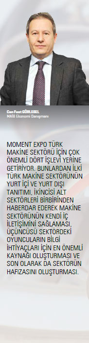 Moment Expo Türk makine sektörü için çok önemli dört işlevi yerine getiriyor. Birincisi, sektörün yurt içi ve yurt dışı tanıtımı, ikincisi alt sektörleri birbirinden haberdar ederek makine sektörünün kendi iç iletişimini sağlaması, üçüncüsü sektördeki oyuncuların bilgi ihtiyaçları için en önemli kaynağı oluşturması ve son olarak da sektörün hafızasını oluşturması.
