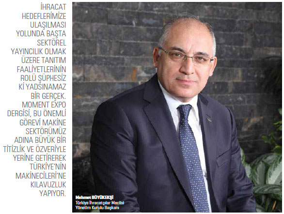 Öte yandan, bizler, üç milyon kişiye istihdam sağlayan 65 bin ihracatçı firmamızın temsilcisi Türkiye İhracatçılar Meclisi olarak, 2023 yılında dünya ticaretinden yüzde 1,5 pay almak ve dünyanın en büyük 10 ekonomisi arasına girebilmek için yüksek katma değerli üretimin olmazsa olmaz bir şart olduğunu hep dile getiriyoruz. Çünkü ancak bu şekilde dünya devleri ile rekabet edebilir, ihracatımızı kalıcı bir biçimde artırarak ekonomimizin sağlıklı ve istikrarlı büyümesine katkıda bulunabiliriz. İşte, tam bu noktada, Ar-Ge, inovasyon, tasarım ve markalaşma alanlarında ihracat hedeflerimize ulaşmak amacıyla pek çok eylem ve etkinlik içerisindeyiz. İhracat hedeflerimize ulaşılması yolunda, başta sektörel yayıncılık olmak üzere tanıtım faaliyetlerinin de rolünün şüphesiz yadsınamaz bir gerçek olduğunu söylemeliyim. Moment Expo Dergisi, bu önemli görevi makine sektörümüz adına büyük bir titizlik ve özveriyle yerine getirerek, Türkiye’nin Makinecileri’ne kılavuzluk yapıyor. Bu vesileyle, makine sektörüne ilişkin en güncel haber ve gelişmeleri ihracatçımız adına bir adım önden takip eden, bunu değerli bilgi ve deneyimlerinin süzgecinden geçirmek suretiyle bizlere aktaran bütün Moment Expo sorumluları ve yayın ekibine sonsuz teşekkürlerimi sunuyor, başarılarının devamını diliyorum.