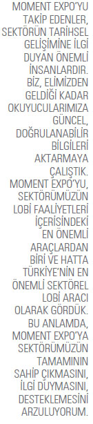 üstlendiği misyonu gereğince yerine getirebilen yayınlar arasındadır. 100’üncü sayısına ulaşan Moment Expo’yu tebrik ediyor, başarılı grafiğinin her sayıda daha da artarak nice nice sayılara ulaşmasını diliyorum.