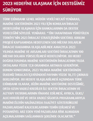 Türk Eximbank Genel Müdür VekiliYeniaras; makine sektörünün dünyadaolduğu gibi ülkemizin sanayileşmesininde itici güç olduğunun altınıçizdi. Yeniaras: “Makine sektörü, Türkiyeihracatı içinde önemli bir payasahip. İhracatımızdaki yüzde 14’lükpayı ile tekstil/konfeksiyon ile otomotivsektörlerinin ardından üçüncüsırada yer alan makine sektörününTürk Eximbank’ın kısa vadeli kredilerindenaldığı pay da aynı seviyedeyer alıyor.Diğer taraftan, 2023 yılı ihracat hedefimizeulaşmak amacıyla hazırlananStrateji ve Eylem Planları’nda da makinesektörü ayrı bir öneme sahiptir.Nitekim TİM tarafından yürütülenTürkiye’nin 2023 İhracat StratejisininSektörel Kırılım Projesi kapsamındahedeflenen 500 milyar dolarlık ihracatrakamına ulaşılabilmek amacıyla2023 yılında makine ve aksamlarısektörü ihracatının 100 milyar dolarayükseltilmesi hedefleniyor. Bu hedefdoğrultusunda makine sektörününihracatının yılda ortalama yüzde17,8 oranında artması gerekiyor. Bununsonucunda, 2023 yılında makinesektörünün ülkemiz ihracatı içerisindekipayının yüzde 18,3’e çıkmasıbekleniyor.”Yeniaras, makine sektöründe 2013yılı hedeflerine ulaşılması için TürkEximbank’ın da çalışmalar yürüttüğünüsöyledi. Yeniaras: “Bu hedefe ulaşılabilmesiaçısından Türk Eximbankolarak, bizim makine sektörüne desteğimizorta-uzun vadeli krediler ilesektör ihracatının ve altyapı yatırımlarınınfinanse edilmesi, ayrıca, ülke/alıcı kredileri ve orta vadeli sigortaprogramlarıyla makinecilerin halihazırdafaaliyet gösterdikleri pazarlardakikalıcılıklarının temin edilmesive potansiyel arz eden yeni pazarlararisk almadan açılmalarının sağlanmasışeklinde olacaktır.”