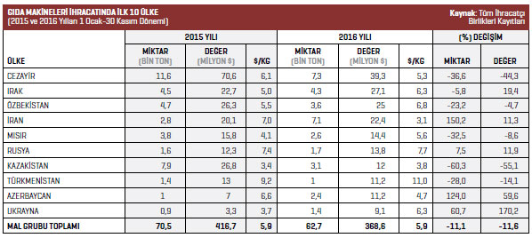 2016 yılının Ocak-Kasım döneminde Türkiye geneli gıda sanayi makineleri sektöründe en fazla ihracat artışının yaşandığı ülke yüzde 170,2 ile Ukrayna oldu. Azerbaycan yüzde 59,6 ile ikinci, Irak ise yüzde 19,4 ile üçüncü sırada yer aldı.
