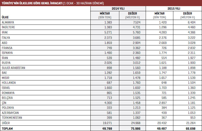 Isıtıcılar ve fırınlar ürün grubunda 2015 yılının Ocak-Haziran döneminde 11,6 milyon dolarla en fazla Almanya’ya ihracat gerçekleştirildi. Listenin ikinci sırasındaki Fransa’ya 2015 yılının Ocak-Haziran döneminde 7,1 milyon dolarlık ihracat gerçekleştirildi. Üçüncü sıradaki İtalya’ya 2014 yılının Ocak-Haziran döneminde ihraç edilen ürünlerin değeri 5,5 milyon dolarken 2015 yılının aynı döneminde bu rakam yüzde 14,3 artışla 6,3 milyon dolar oldu. Listenin dördüncü ve beşinci sırasında ise sırasıyla Suudi Arabistan ve Rusya yer alıyor. Dördüncü sıradaki Suudi Arabistan’a 2015 yılının Ocak-Haziran döneminde gönderilen ürünlerin değeri 5,1 milyon dolar oldu. 2014 yılının aynı döneminde bu rakam 3,5 milyon dolardı. Söz konusu ülkeye yönelik ihracat artışı yüzde 44,6 oldu. Beşinci sıradaki Rusya’ya 2015 yılının Ocak-Haziran döneminde 4,9 milyon dolarlık ısıtıcılar ve fırınlar ihracatı gerçekleştirildi.