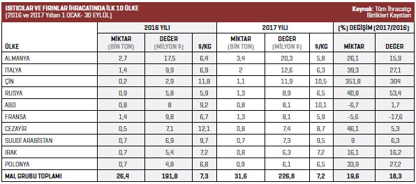 2017 yılının Ocak-Eylül döneminde ısıtıcılar ve fırınlar mal grubunda en fazla ihracat artışı yüzde 304 ile Çin’de yaşandı. Bu ülkenin ardından yüzde 53,4 ile Rusya gelirken yüzde 27,2 ile Polonya üçüncü sırada yer aldı.