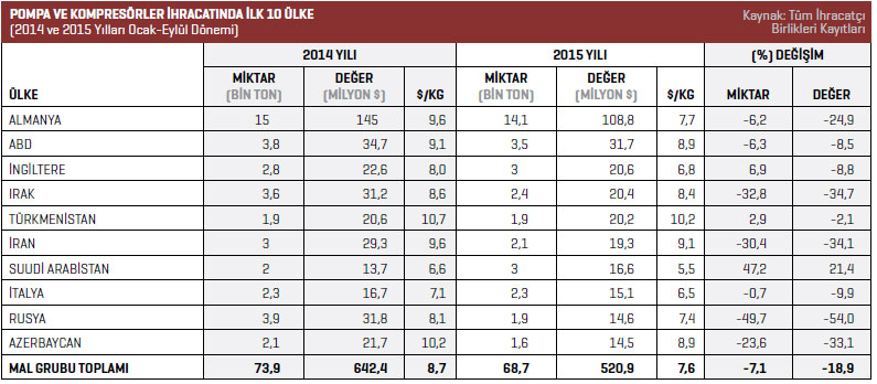 Pompa ve kompresörler ürün grubunda, 2015 yılının Ocak-Eylül döneminde en fazla ihracat gerçekleştirilen ülke 108,8 milyon dolarla Almanya oldu. Listenin ikinci sırasında bulunan ABD’ye 2015 yılının Ocak-Eylül döneminde gönderilen ürünlerin değeri 31,7 milyon dolar olarak kaydedildi. Üçüncü sırada bulunan İngiltere’ye 2015 yılının Ocak-Eylül döneminde 20,6 milyon dolar değerinde ürün ihraç edildi. Dördüncü sıradaki Irak’a 2015 yılının Ocak-Eylül ayında 20,4 milyon dolar değerinde pompa ve vana ihraç edildi. Beşinci sıradaki Türkmenistan’a 2015 yılının Ocak-Eylül döneminde pompa ve kompresörler kaleminde ihraç edilen ürünlerin değeri 20,2 milyon dolar oldu.