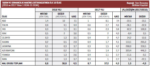 2017 yılının 1-31 Ocak döneminde Türkiye geneli tarım ve ormancılıkta kullanılan makineler ürün grubunda ihracat artışının en fazla yaşandığı ülke yüzde 446,3 ile Azerbaycan oldu. İkinci sırada yüzde 318,5 ile Ukrayna yer alırken söz konusu ülkeyi yüzde 205 ile Sudan takip etti.