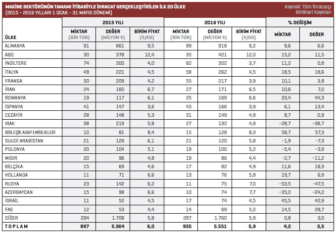 Türbin, turbojet, hidrolik silindir aksam ve parçaları ihracatı 2016 yılının Ocak-Mayıs döneminde 145,5 milyon dolar olarak kaydedildi. 2015 yılının aynı döneminde bu rakam 140,1 milyon dolar seviyesindeydi.