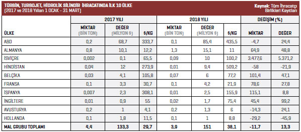 Türbin, turbojet, hidrolik silindirler ihracatı 2017 yılının Ocak-Mart döneminde 133,3 milyon dolarken, 2018 yılının aynı döneminde bu rakam yüzde 13,3 artışla 151 milyon dolar seviyesine yükseldi.