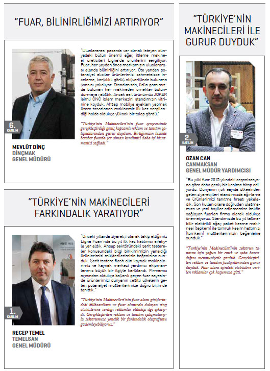 Türkiye’nin Makinecileri, fuar alanının çeşitli noktalarına ve shuttle’lara verdiği “Turkish Machinery” imzalı reklamlarla Türk makine sektörünün üretim gücünün altını çizdi. Türkiye’nin Makinecileri ayrıca fuara katılan Türk firmalarının stant numaralarını ve ürün bilgilerini de içeren broşür hazırlayarak ziyaretçilere dağıttı. Fuara MAİB ve Türkiye’nin Makinecileri’ni temsilen Makine Şubesi Uzmanları Işıl Aydın ve Tuğçe Karabörk Okan katıldı. Makine alt sektör derneklerini kendi ihtisas fuarlarında desteklemeye devam eden Türkiye’nin Makinecileri’nin standında, MSSP üyesi derneklerden Ağaç İşleme Makine ve Yan Sanayisi İş Adamları Derneği’nin (AİMSAD) temsilcisi de hazır bulunarak fuar ziyaretçilerine, sektörleri ve üye firmaları hakkında bilgi verdi. Fuarın ikinci günü AİMSAD tarafından Türkiye’nin Makinecileri’nin standında düzenlenen kokteyle Türk firmalarının temsilcilerinin yanı sıra, Hannover Başkonsolosu Banu Malaman, Hannover Ticaret Ataşesi Ruhi Deniz ile Almanya’da temasta bulunulan kurumların temsilcileri katıldı. Türkiye’nin Makinecileri’nin standında fuar süresince ziyaretçilere üye firmaların iletişim bilgilerinin yer aldığı katalog ve CD dağıtılarak Türk makine sektörü ile Türkiye’nin Makinecileri’nin çalışmaları hakkında detaylı bilgi verildi.