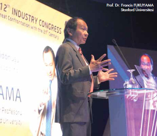 İSO 12. Sanayi Kongresi’ne Stanford Üniversitesi Siyasal Bilimler Profesörü Francis Fukuyama konuk oldu. Kongrenin ikinci bölümünde sanayicilere hitap eden Fukuyama, Soğuk Savaş’ın ardından iki kutuplu dünyanın dağıldığı-artırdığını dile getirdi. 11 Eylül saldırılarının ardından siyasal ve ekonomik olarak yeni bir dönemin başladığını belirten Fukuyama, “Bu dönem gelişmekte olan ülkelerin dönemiydi. Gelişmekte olan ülkeler büyüdü. Tabii Türkiye de bunlar içindeydi. Ama Türkiye’nin durumu onlardan ayrıydı. Türkiye’nin büyümesinde ihracatın yanında sanayinin de payı vardı” dedi. Francis Fukuyama’nın ardından Çin-Hindistan Enstitüsü Kurucu Ortağı Haiyan Wang da “Akıllı Küreselleşme” başlıklı bir sunum gerçekleştirdi. Kongrenin son bölümünde ise Sabah Gazetesi Ekonomi Müdürü ve Köşe Yazarı Şeref Oğuz’un moderatörlüğünde gerçekleştirilen “Türkiye’de Vasatlık ile Yüzleşme” paneline; MAİB ile MTG Yönetim Kurulu Başkanı, İSO Yönetim Kurulu Başkan Yardımcısı ve Kongre Program Komitesi Başkanı Adnan Dalgakıran, İstanbul Ticaret Üniversitesi Rektörü Prof. Dr. Nazım Ekren, Alarko Şirketler Topluluğu Yönetim Kurulu Başkanı İshak Alaton, Sen De Gel Derneği Yönetim Kurulu Başkanı İbrahim Betil ve Konda Genel Müdürü Bekir Ağırdır konuşmacı olarak katıldı. Türkiye’de vasatlık ile yüzleşme