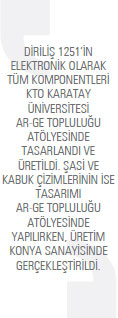Dört metre uzunluğundaki Diriliş 1251, 6 kW batarya gücüyle 110 kilometre/saat hıza ulaşabiliyor. Motor, motor sürücü, batarya yönetim sistemi, yerleşik şarj birimi, batarya paketlemesi, telemetri, araç kontrol sistemi ve mekanik aksam bakımından tamamen KTO Karatay Üniversitesi öğrencilerinin tasarımı olarak yerlilik alanında da önemli bir adım olan Diriliş 1251, aslen, TÜBİTAK tarafından her yıl üniversite öğrencilerine yönelik olarak gerçekleştirilen Alternatif Enerjili Araç Yarışması (TÜBİTAK Efficiency Challange) projesi olarak yola çıkmış. Elektrik elektronik mühendisliği bölümü öğrencileri Ömer Emre Gümüşel, Hakan Güneş, Mahmud Sami Çınar, Muhammed Emin Arı, Ahmet Keskin ve Mehmet Akif Süllü ile mekatronik mühendisliği bölümünden Mehmet Çolak, Mustafa Yayangil ve Mahmut Yarar’ın projelendirdiği Diriliş 1251’in elektronik olarak tüm komponentleri KTO Karatay Üniversitesi Ar-Ge Topluluğu atölyesinde tasarlandı ve üretildi. Şasi ve kabuk çizimlerinin ise tasarımı Ar-Ge Topluluğu atölyesinde yapılırken, üretim Konya sanayisinde gerçekleştirildi. Bu kapsamda projenin geliştiricileri olan Ar-Ge Topluluğu öğrencileri, “Konya sanayisinin gerek elektrik elektronik, gerekse mekanik anlamda bize çok faydası ve desteği olduğunu söylemeliyiz. KTO Karatay Üniversitesi Yönetimi ve Mütevelli Heyeti Başkanı Selçuk Öztürk de projemizi destekleyerek bizlere büyük motivasyon sağladı” diyor.